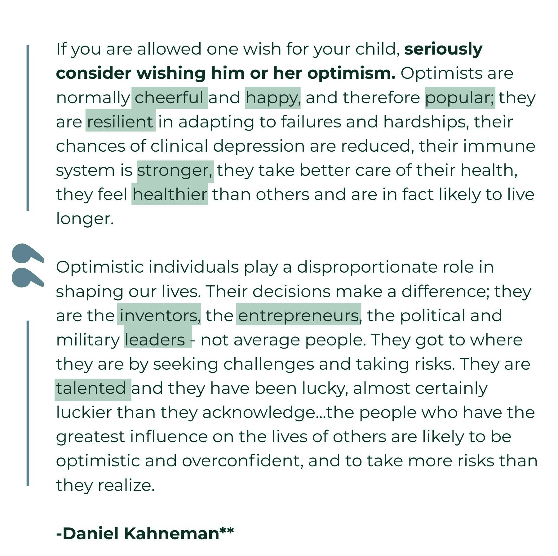 I've always agreed with Nick Murray that optimism is the only realism. Daniel Kahneman identified the benefits of optimism as a critical component of an effective life.