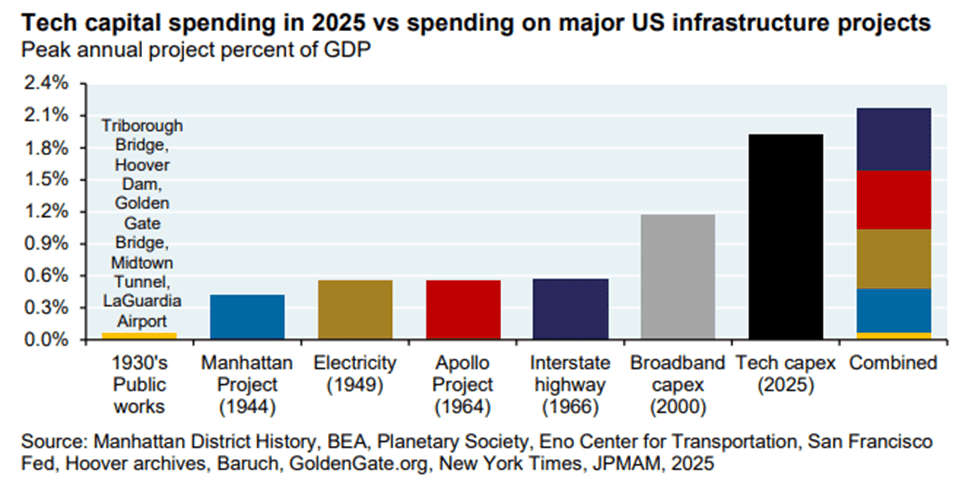 In 2025, spending by US tech companies (largely on these computer chips mentioned above) was almost as much as the 1930's Public Works projects under FDR, the Manhattan Project, electricity installation in 1949, the Apollo project, the Interstate Highway project in 1966, and broadband installation in the 2000's combined.
